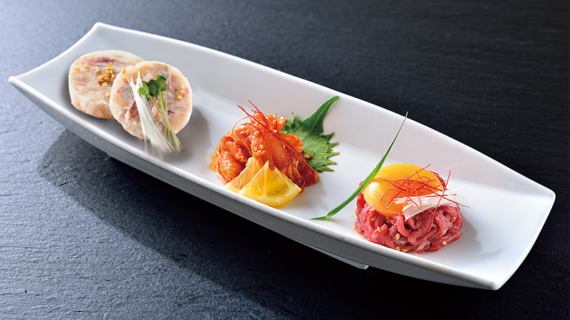 刺し ミノ刺 1,080円(税込1,188円) 和牛ユッケ(赤身 or 味噌 or チーズ) 1,400円(税込1,540円) 美コラーゲン豚足 680円(税込748円) 刺身3点盛り(和牛ユッケ風・ミノ・豚足) 1,480円(税込1,628円)